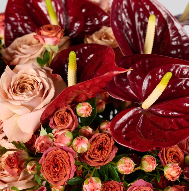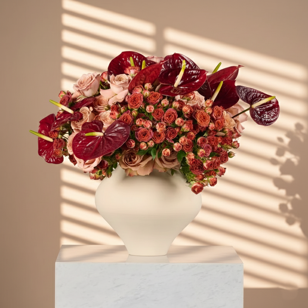 Cinnamon Spice blends Spray Roses, Cappuccino Roses, and Burgundy Anthurium in an elegant off-white clay pot, creating a warm, rich, and modern seasonal arrangement.