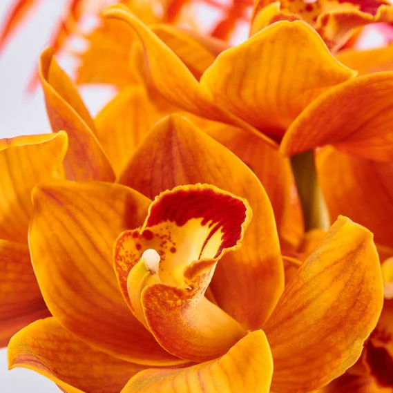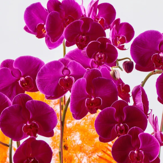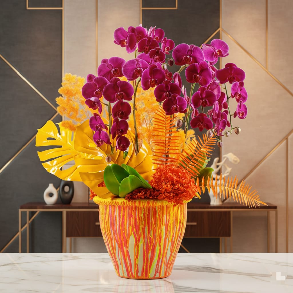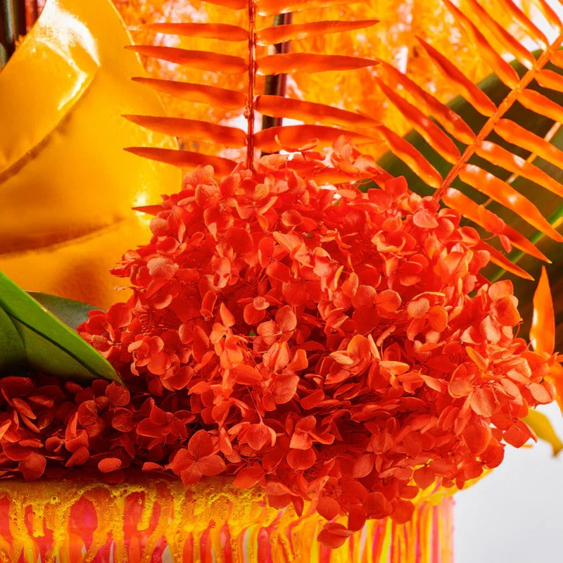 Sweet Coral is a bold summer-inspired arrangement featuring vibrant Phalaenopsis, dried orange botanicals, and a hand-painted monstera leaf, all presented in a custom painted pot for a striking, colorful display.